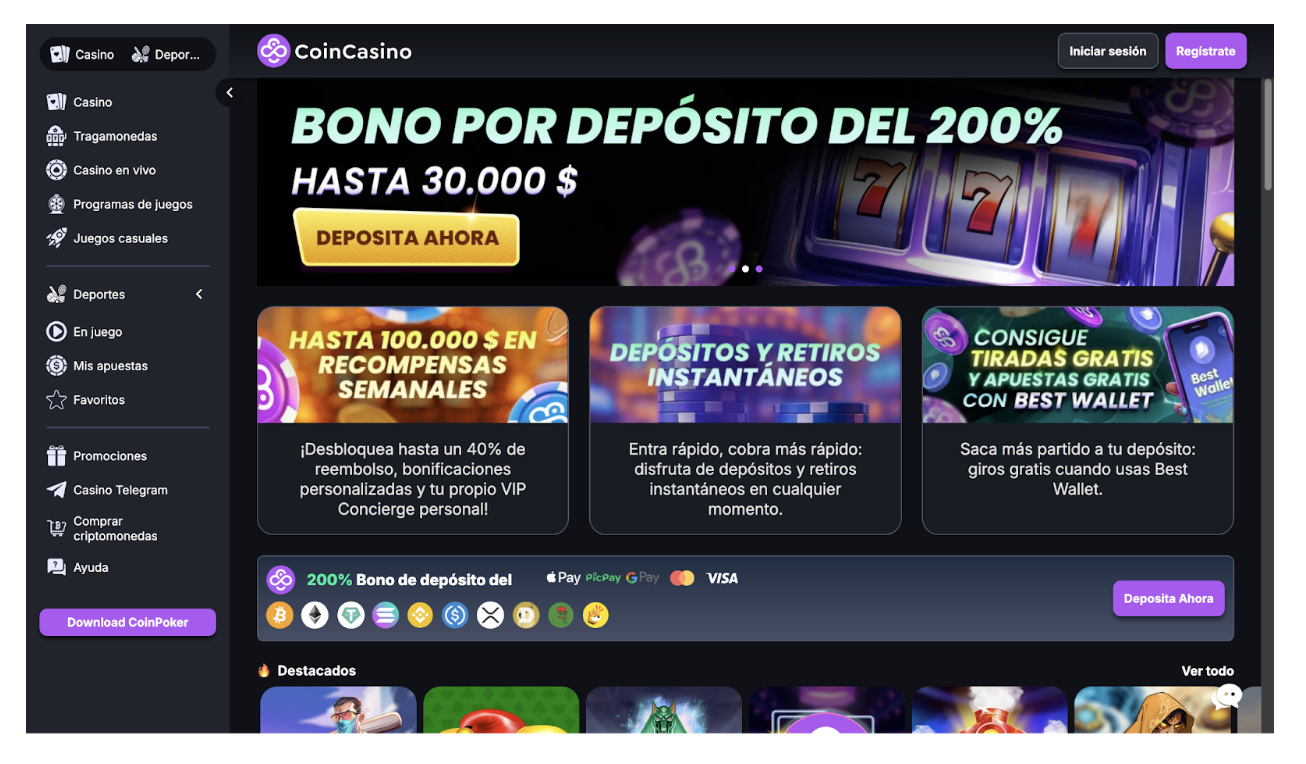 Lo que realmente marca la diferencia es su registro sin KYC y el uso exclusivo de criptomonedas para depósitos y retiros inmediatos. Bitcoin, Ethereum, Tether o Solana son solo algunas de las opciones disponibles, todas con transacciones seguras y sin esperas. Esa rapidez ha hecho que Coin Casino sea una de las casas más queridas por los jugadores latinoamericanos.
