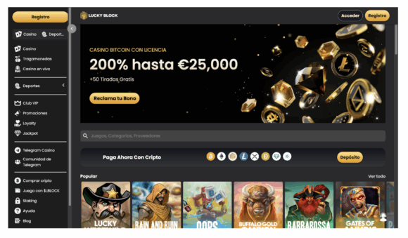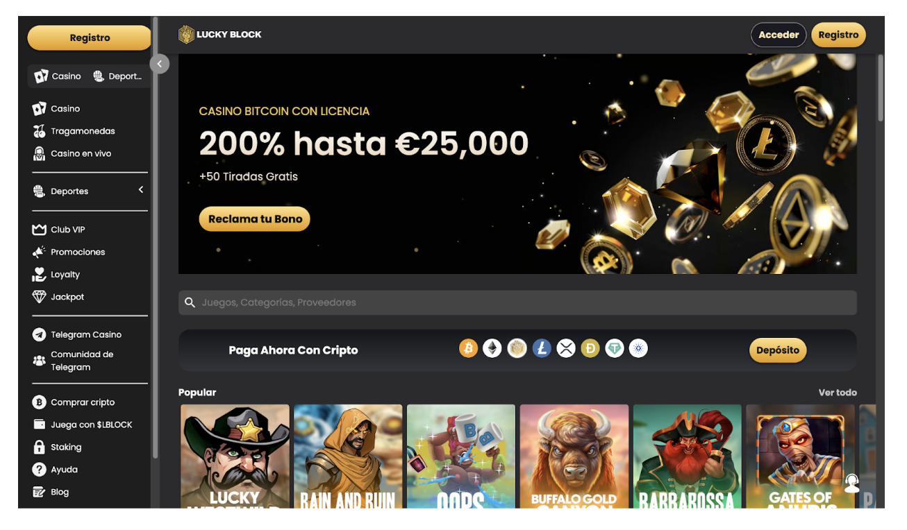 El sitio opera bajo licencia de Curaçao Gaming Authority y cuenta con cifrado SSL y autenticación en dos pasos, garantizando total seguridad en cada transacción. Los depósitos y retiros son inmediatos, con soporte para Bitcoin, Ethereum, Tether, Litecoin, Solana y su propio token $LBLOCK, que ofrece ventajas exclusivas a los usuarios frecuentes.