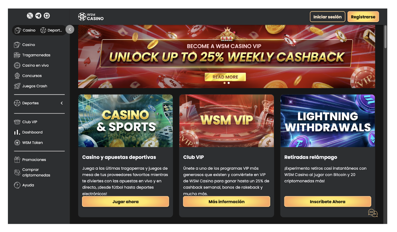 El punto fuerte de WSM está en su velocidad de pagos. Acepta Bitcoin, Ethereum, Tether, Solana, Ripple y otras criptomonedas, con retiros inmediatos y sin procesos tediosos. Además, su token propio $WSM ofrece beneficios exclusivos, bonificaciones y un sistema de recompensas para jugadores activos.