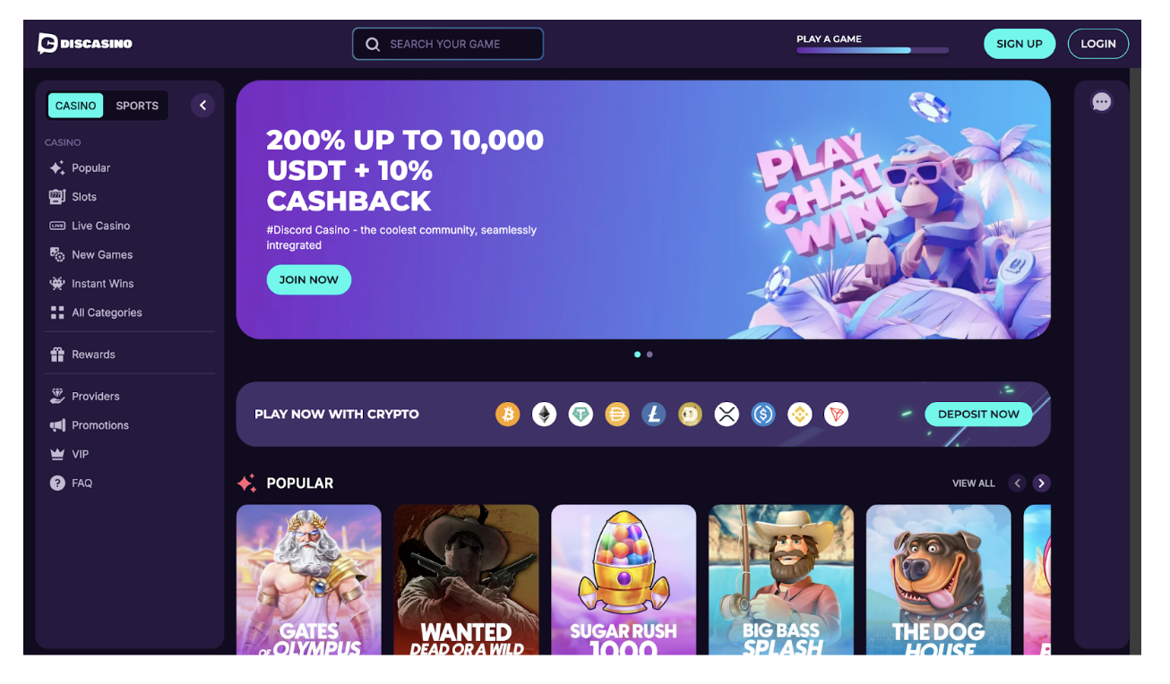 - Discasino – Bono del 200 % hasta $10.000 USDT