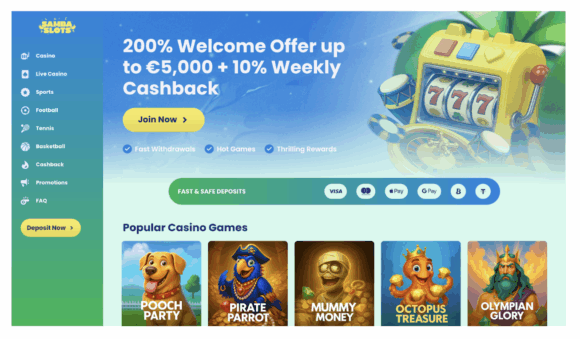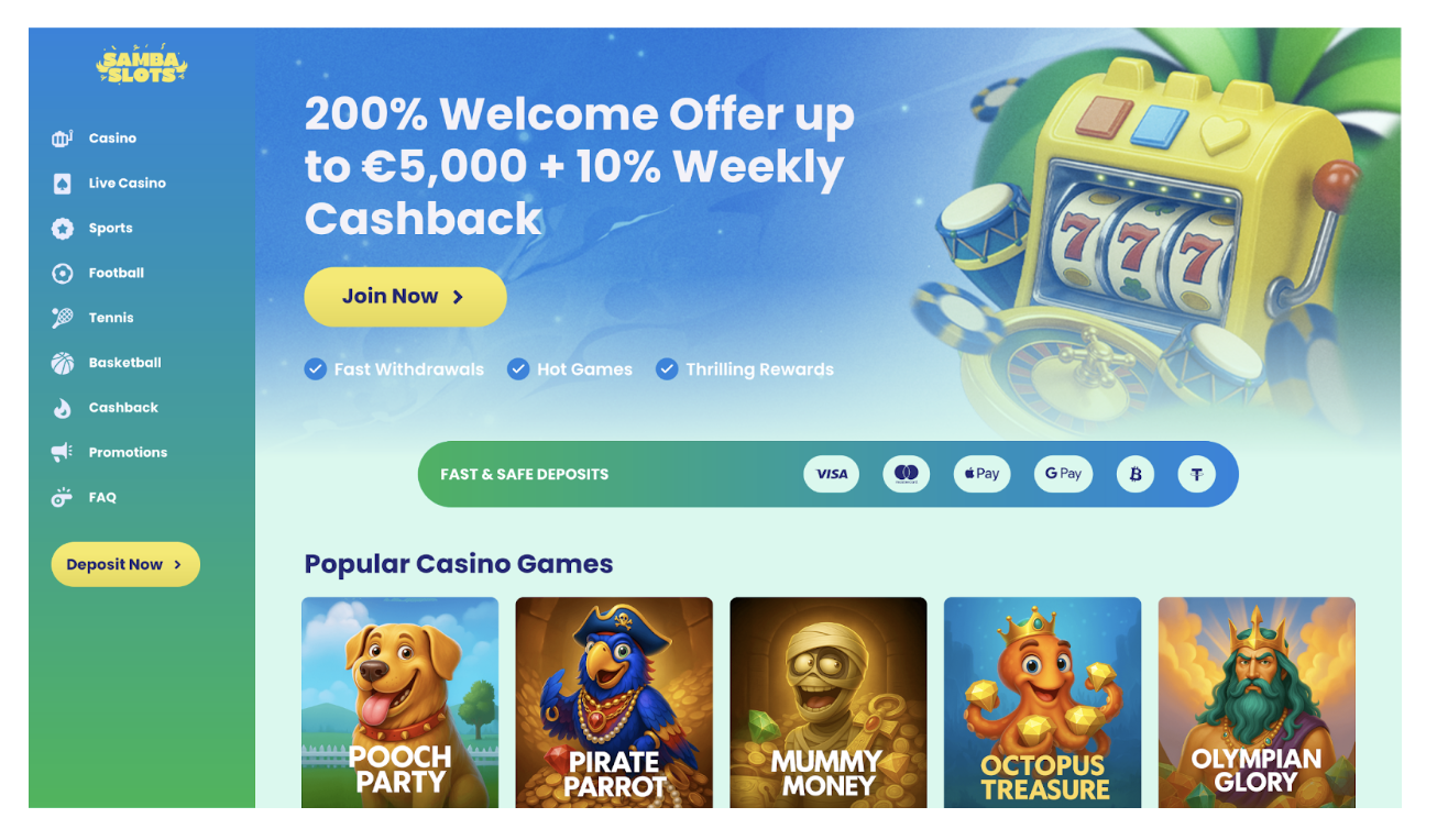 Además del deporte, Samba Slots ofrece una amplia selección de juegos de casino, incluyendo tragaperras, ruleta, póker y shows en vivo. Su bono del 200 % hasta $5.000 más 50 giros gratis es ideal para quienes disfrutan de ambos mundos. En resumen, Samba Slots es pura energía: apuestas rápidas, retiros inmediatos y un ambiente que contagia entusiasmo.