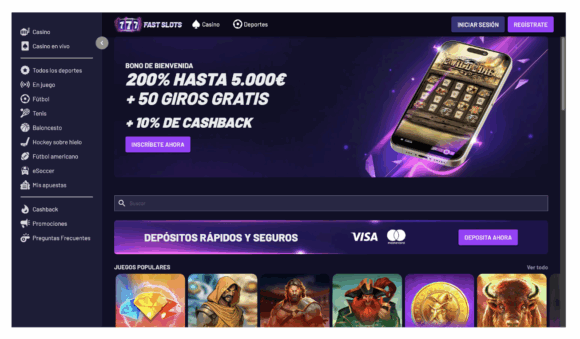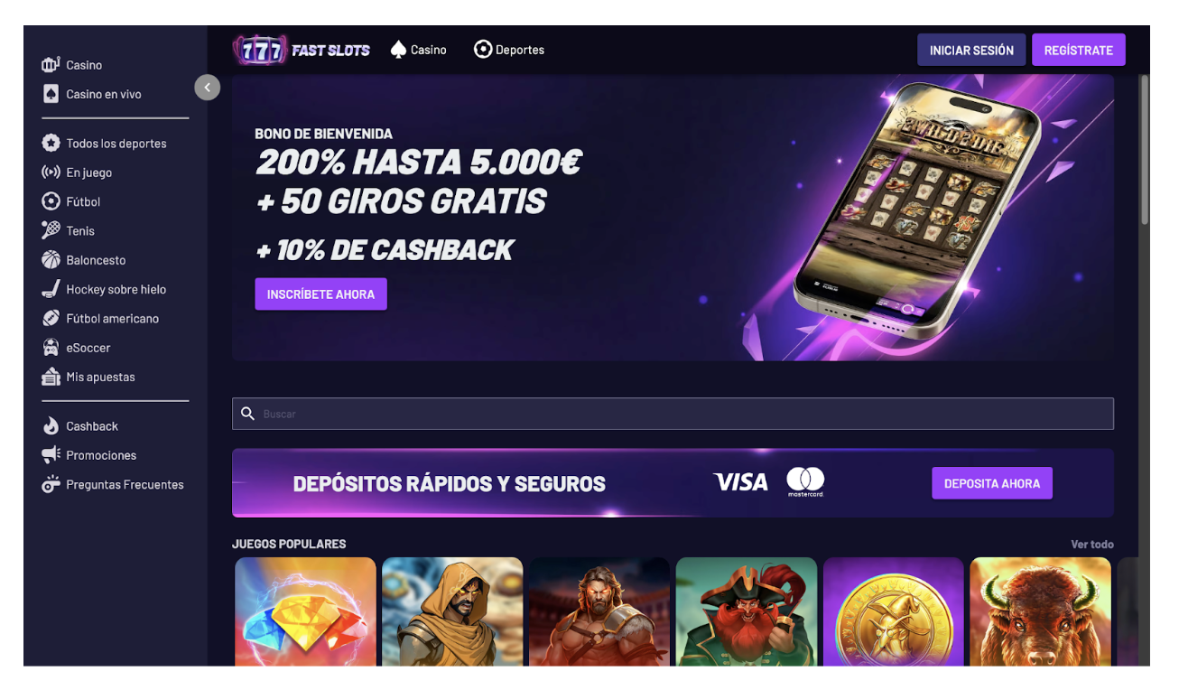 Fast Slots aterrizó en 2025 con una propuesta clara: velocidad y eficiencia entre las mejores apuestas deportivas. Su sección deportiva ofrece cuotas dinámicas y una cobertura amplia de eventos, desde fútbol, tenis y baloncesto hasta boxeo, MMA y eSports, con un sistema de apuestas en vivo que responde al instante. La interfaz es ligera, el registro se completa en segundos y el soporte está disponible las 24 horas, algo que suma puntos para quienes apuestan con frecuencia.