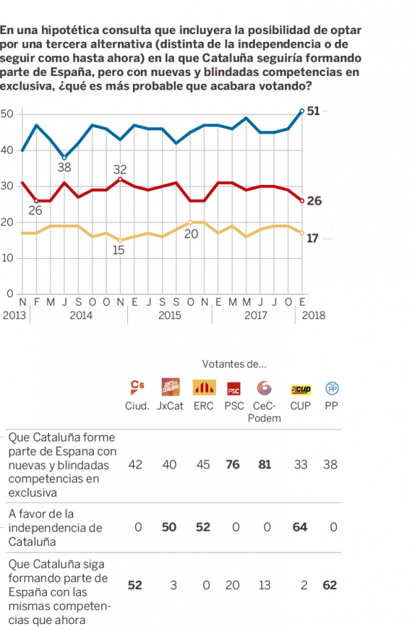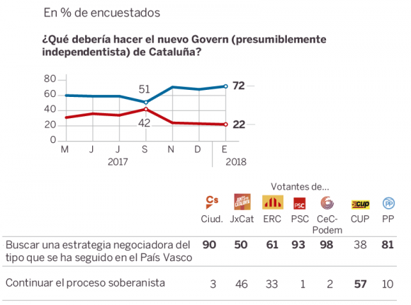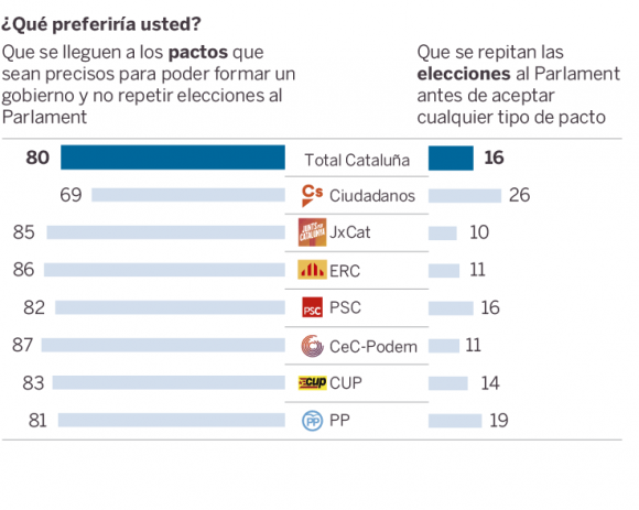 Sondeo de Metroscopia publicado en el diario El País, sobre la visión que los catalanes tienen del futuro de su comunidad tras las elecciones del 21-D. Se parte de mil entrevistas realizadas en toda Cataluña hasta el 15 de enero.