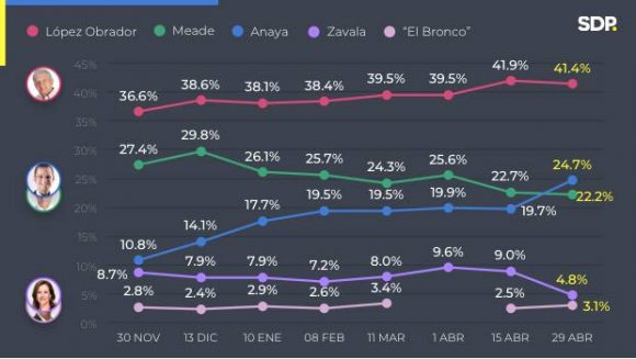 Encuesta de México Elige para SDP-Noticias en Facebook: López Obrador estable en la cima mientras que Anaya adelanta a Meade. Zavala se desinfla.