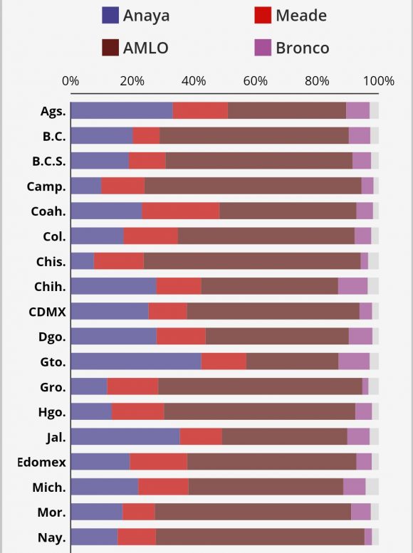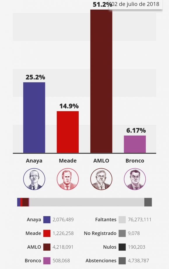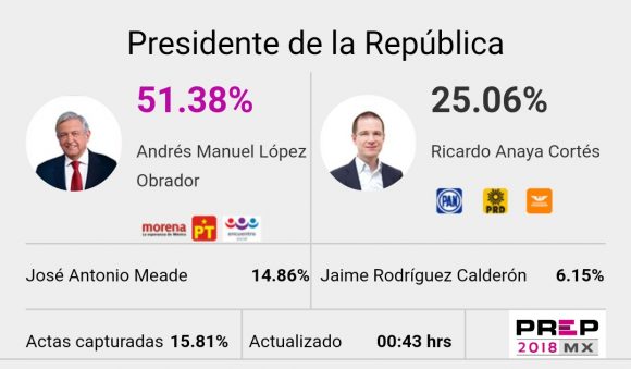 Actualización: Con el 16% del escrutinio, Obrador se alza con el 51% de los votos ganando en prácticamente todos los estados federales.