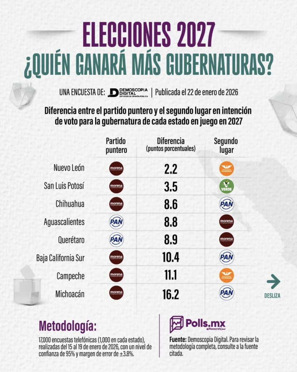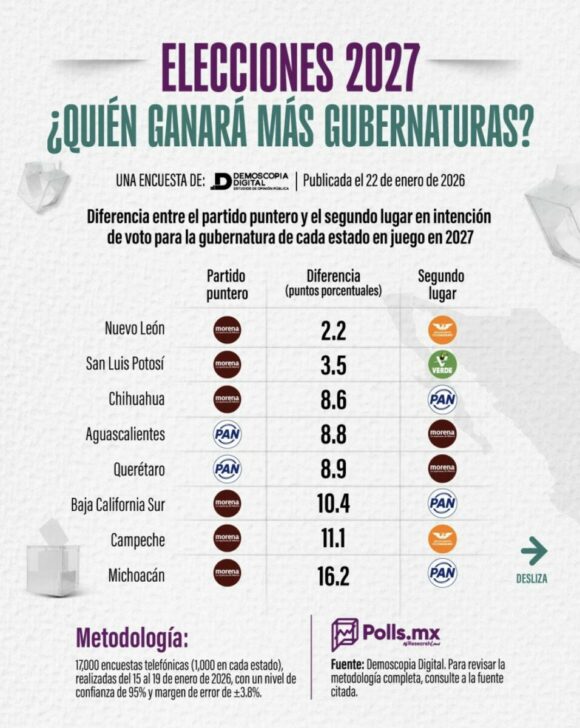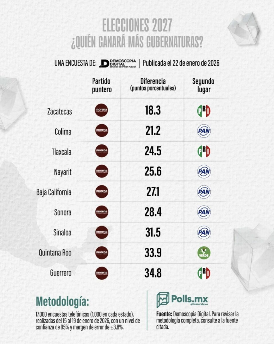Son datos que se desprenden de una encuesta elaborada por Demoscopia Digital en coordinación con la plataforma Polls.mx, que llevó a cabo 17,000 entrevistas telefónicas, mil en cada entidad donde habrá elección a gobernador en 2027, con un nivel de confianza de 95% y margen de error de ±3.8 puntos. El estudio se publicó el 22 de enero de 2026 y mide la intención de voto por partido, sin nombres de candidatos, lo que ofrece una fotografía de la correlación de fuerzas partidistas a año y medio de los comicios.