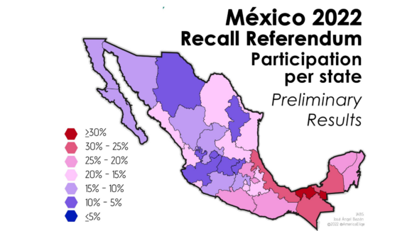 México ha celebrado este domingo una votación para evaluar la continuación del mandato de López Obrador, que se ha saldado con más de un 91 por ciento de los apoyos, si bien la participación ha rondado el 18 por ciento, muy por debajo del 40 por ciento necesario para considerar la consulta como vinculante. Los resultados fueron: 91,8% continuar, 6,4% revocar y 1,6% nulos, abstención 82%
