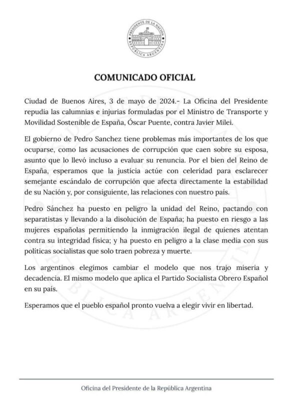 En un comunicado publicado por la Oficina del Presidente de Argentina en su cuenta oficial de la red social X, el mandatario “repudia las calumnias e injurias” formuladas por Puente durante una charla celebrada en España y se dirige a Pedro Sánchez, a quien dice que “tiene problemas más importantes de los que ocuparse, como las acusaciones de corrupción que caen sobre su esposa, asunto que lo llevó incluso a evaluar su renuncia”.