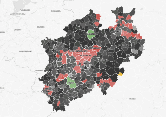 El mapa electoral evidencia una clara polarización. La CDU domina en la mayor parte de los distritos rurales y semiurbanos; la SPD conserva reductos en el Ruhr, aunque debilitados; los Verdes se afianzan en ciudades universitarias como Colonia y Münster; y la AfD penetra con fuerza en áreas industriales deprimidas y zonas del este de NRW.