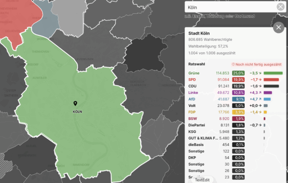 Con más de 800.000 electores, Colonia revalidó su condición de bastión progresista. Los Verdes se impusieron con el 25% de los votos, por delante de la SPD (19,9%) y la CDU (19,9%). La ciudad, gobernada por la independiente Henriette Reker desde 2015, combina un tejido económico basado en los medios de comunicación, ferias comerciales y servicios avanzados. La presencia verde refleja un electorado urbano y cosmopolita.