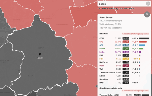 La antigua sede del imperio Krupp confirma el dominio de la CDU, que se impuso con el 30,3%. La SPD quedó segunda con el 22,7%, mientras que la AfD escaló al 16,9%. El alcalde democristiano Thomas Kufen encarna esta transformación: Essen, antaño feudo socialista, se ha volcado hacia el centro-derecha tras la reconversión industrial, hoy centrada en energía y servicios.
