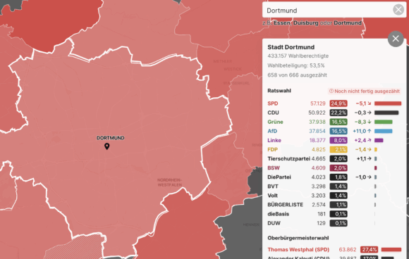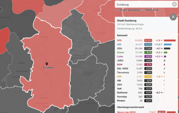 En Duisburg, la SPD logra uno de sus pocos triunfos claros (32,6%), gracias a la figura del alcalde Sören Link. Sin embargo, el espectacular ascenso de la AfD al 21,2% amenaza el futuro dominio socialdemócrata en una ciudad todavía marcada por la siderurgia y su enorme puerto fluvial. La CDU y los Verdes retrocedieron con fuerza.