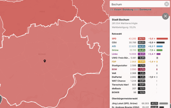 El bastión industrial de Bochum mantuvo al SPD como primera fuerza con un 28,1%, aunque con un descenso notable. La AfD (14,9%) y la Izquierda (9,5%) se beneficiaron de la fragmentación del voto progresista. El alcalde Thomas Eiskirch (SPD) gobierna en un contexto de reconversión hacia la educación y la innovación tecnológica, simbolizada por la Universidad del Ruhr.