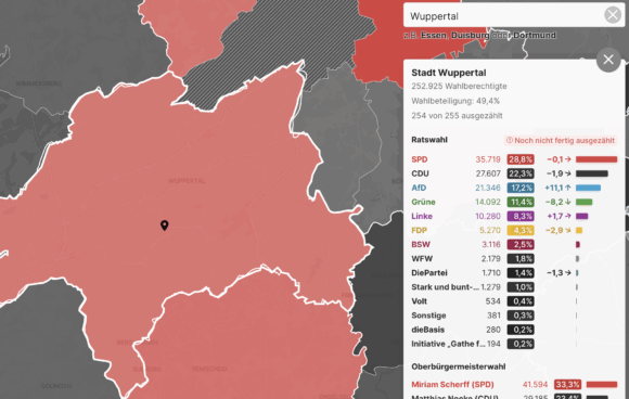 Gobernada por el verde Uwe Schneidewind, Wuppertal vivió una paradoja: la SPD ganó en las urnas con el 28,8%, pero la AfD protagonizó un salto espectacular hasta el 17,2%. Tradicional ciudad textil, hoy apuesta por la investigación medioambiental (Wuppertal Institut). El voto fragmentado revela tensiones entre su tradición socialdemócrata y un electorado cada vez más polarizado.