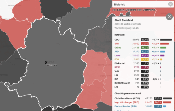 El centro manufacturero y sede de empresas como Dr. Oetker o Schüco se inclinó hacia la CDU (29,4%), seguida por la SPD (21,7%). La AfD escaló hasta el 12,2%, reflejo de su capacidad de penetración en ciudades medias del este de NRW. Aunque gobernada tradicionalmente por socialdemócratas, Bielefeld refleja un desplazamiento hacia la derecha moderada.