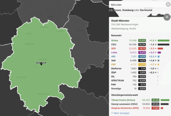 Ciudad universitaria por excelencia, Münster reafirmó su excepcionalidad dentro de NRW: los Verdes lideraron con el 31,6%, por delante de la CDU (31,3%). Pese a que el alcalde es el democristiano Markus Lewe, la urbe se consolida como el otro gran bastión verde junto a Colonia, sustentada en un electorado joven, académico y cosmopolita.