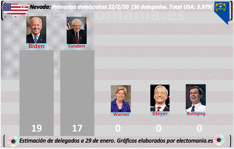 La asignación de delegados hoy por hoy se reduciría a dos candidatos, Sanders y Biden. Warren, Steyer, e incluso Buttigieg, podrían llegar a entrar, aunque de momento están lejos de conseguirlo. Si alguno de ellos lo lograra, mermaría sensiblemente el número de delegados que consigan los dos primeros.