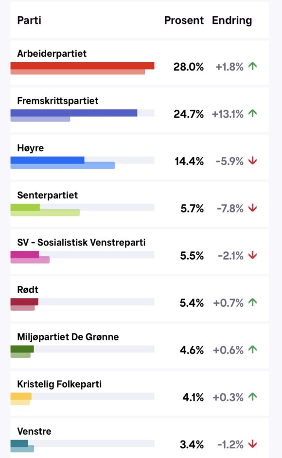 Partido del Progreso (FrP): 24,7% (+13,1) – 49 escaños
