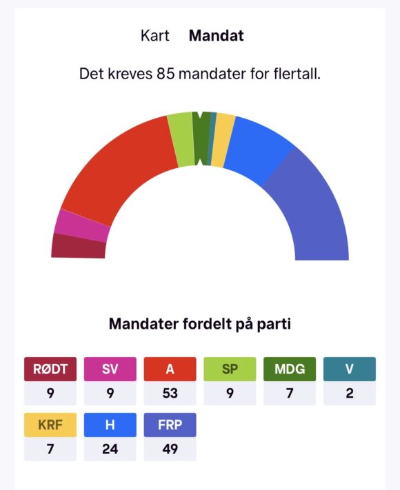 La mayoría absoluta en el Parlamento noruego requiere 85 escaños.