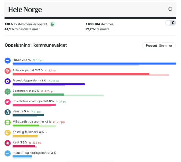 Los resultados de las elecciones también muestran que los partidos de derecha están ganando terreno en Noruega. El Partido del Progreso, que es un partido liberal conservador, ha aumentado su participación en las elecciones.