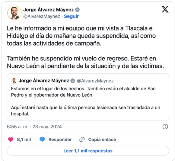 “Los integrantes de mi equipo que resultaron lesionados ya están siendo atendidos en el hospital. Me dirijo nuevamente al lugar de los hechos para acompañar a las víctimas”, escribió Álvarez Máynez en la red social X.