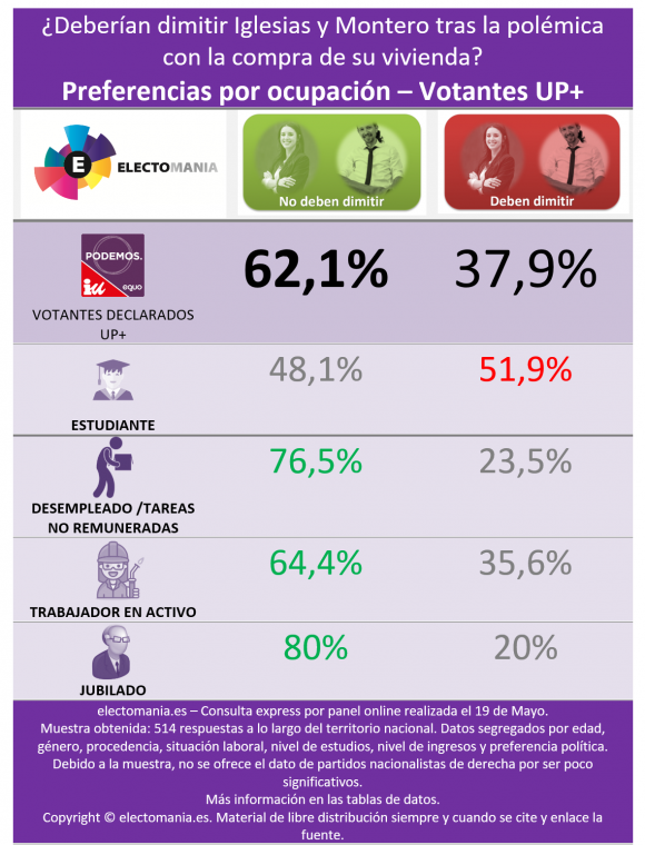 Curioso es el desglose de resultados por ocupación de los encuestados, y es que mientras quienes se encuentran estudiando son los más partidarios de la dimisión de la portavoza y el líder de Podemos, los jubilados y desempleados no consideran que deban irse, al contrario que quienes están actualmente trabajando.