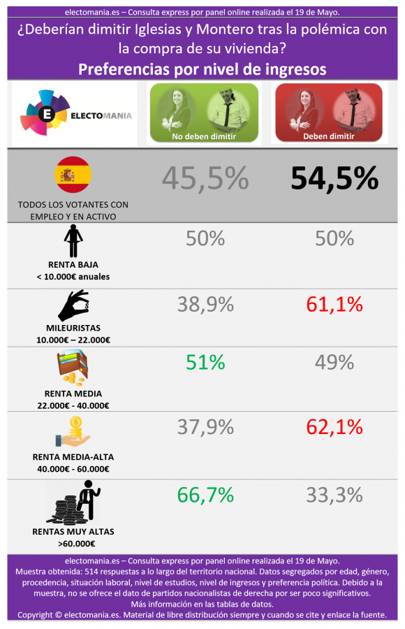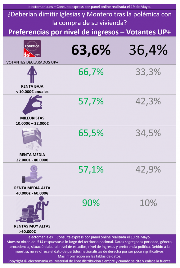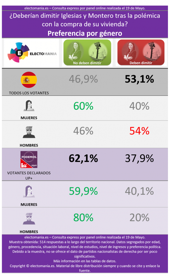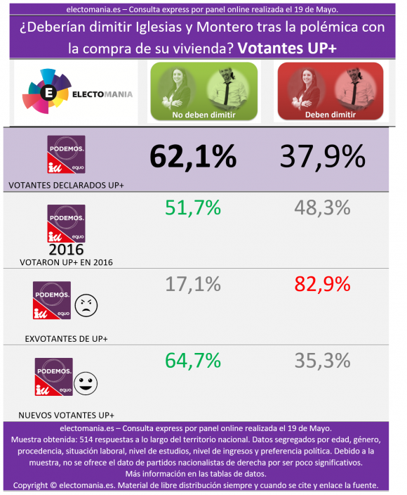 Si nos fijamos en términos generales, la amplia mayoría de los votantes de los distintos partidos cree que Irene y Pablo deben dimitir y entregar su acta de Diputado. Únicamente los votantes de UP+ apoyan a sus dirigentes.
