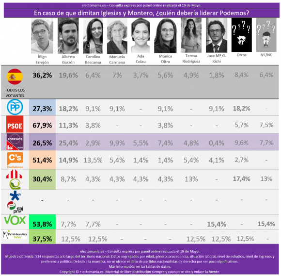 Preguntados los internautas sobre quién sería la mejor opción para liderar el partido en caso de que finalmente Montero e Iglesias abandonen sus cargos, la mayoría de los votantes apuestan por Íñigo Errejón, al que sigue de cerca Alberto Garzón, siendo particularmente llamativo es el respaldo a Errejón que muestran los votantes de PSOE y Ciudadanos.