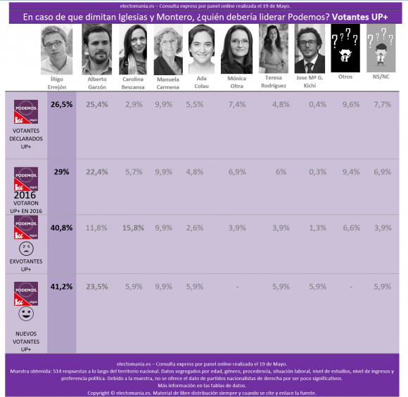 En el subconjunto de UP+ se repiten los patrones aunque en un empate Errejón-Garzón, si bien destaca el apoyo incontestable de los exvotantes de la formación hacia Errejón y Bescansa, que desbanca a Garzón, quien sin embargo es mejor valorado entre los nuevos votantes frente a Bescanda. Otros perfiles como Colau, Kichi, Carmena o Teresa Rodríguez no consiguen despertar la simpatía de la mayoría.