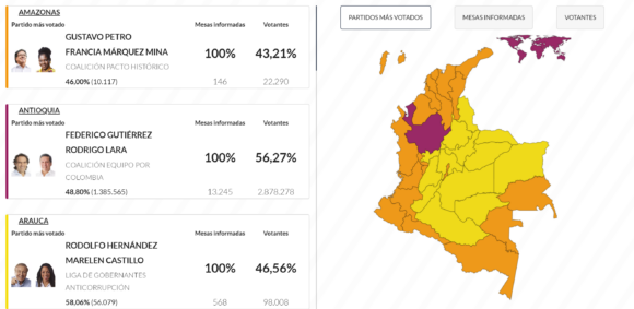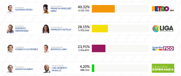 Gutiérrez sería el tercero con un 23,91 por ciento de votos. Es la tercera vez que Gustavo Petro se presenta a unas elecciones presidenciales en Colombia, pero esta vez era el favorito en las encuestas, y tras los resultados de la primera vuelta espera convertirse en el primer presidente de izquierda de Colombia.