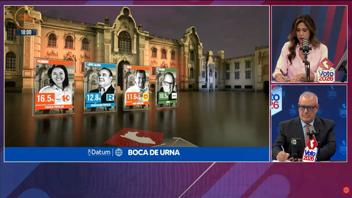 Estos datos son coherentes con el segundo sondeo de boca de urna difundido por Datum, que también sitúa a Fuerza Popular en cabeza, con un 16,5% de los votos. La coincidencia entre ambas encuestas refuerza la hipótesis de un liderazgo claro pero insuficiente para dominar el escenario político.