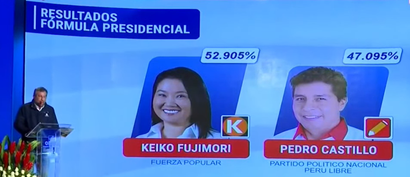 Finalmente, la autoridad nacional de recuento anunció, entrada la madrugada que, con el 42% del voto escrutado, Fujimori adelantaba a Castillo por casi seis puntos. No obstante faltaba procesar el voto exterior, y, sobre todo, el “voto rural” y “voto de selva“, que en este país son fundamentales y aportan más de la mitad de los sufragios.