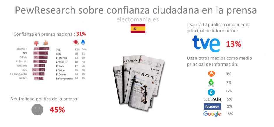 Sondeo europeo de Pew Research pregunta a los ciudadanos sobre la neutralidad política de la prensa, su confianza en ella y los medios principales usados para informarse: