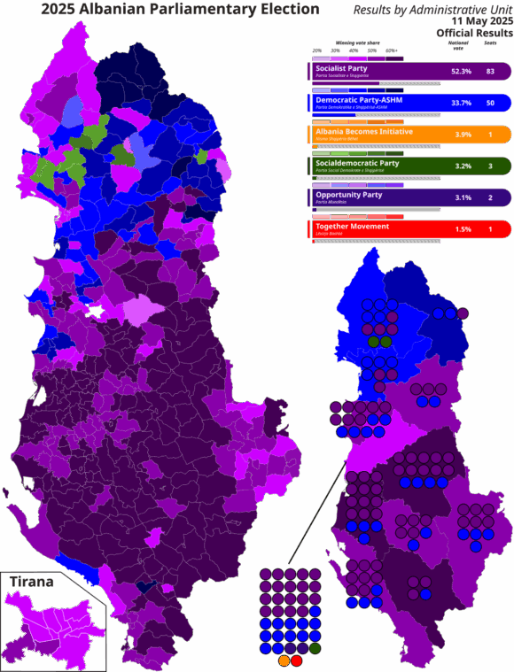 Situación política: Albania celebró elecciones parlamentarias el 11 de mayo de 2025, que consolidaron el dominio del Partido Socialista (PS) bajo el liderazgo de Edi Rama, quien busca un cuarto mandato consecutivo. El país mantiene un sistema parlamentario con 140 escaños y necesita 71 para la mayoría absoluta.