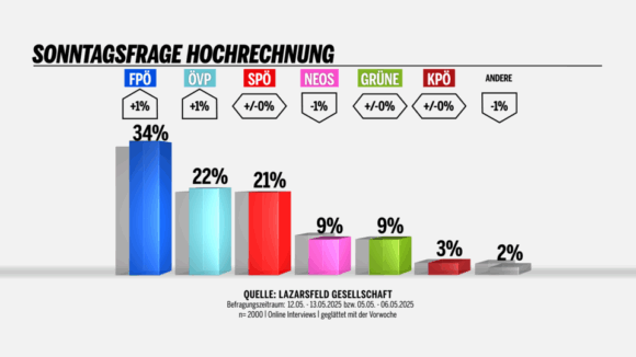 Última encuesta: Una encuesta de Lazarsfeld-Gesellschaft del 13 de mayo de 2025 muestra a FPÖ con un 34%, SPÖ con un 22% y ÖVP con un 20%.