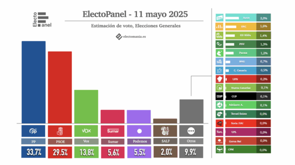Última encuesta: El último ElectoPanel muestra al PP con un 33,7% (144 escaños), PSOE con un 29,5% (122 escaños) y Vox con un 13,8% (37 escaños). En cambio el CIS (5-8 de mayo) da al PSOE un 32% y al PP un 29,3%.