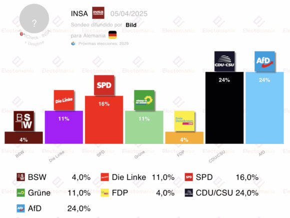 Última encuesta: Los últimos sondeos muestra una lucha por la primera posición entre CDU/CSU y AfD, ambos en torno al 25% de apoyos.