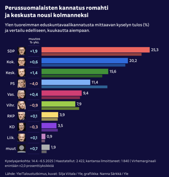 Última encuesta: Una encuesta de Taloustutkimus (14 de abril-6 de mayo de 2025) muestra a SDP con un 25,3%, KOK con un 20,2% y KESK con un 15,6%.