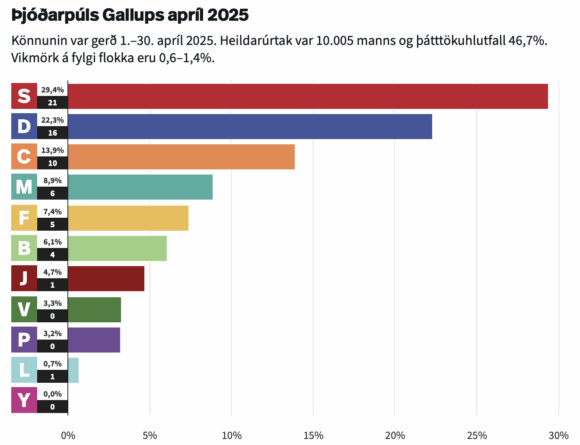 Última encuesta: El último sondeo de Gallup de mayo de 2025 muestra a los socialdemócratas con un 29,4%, a los Independientes con un 22,3% y a los liberales de Viðreisn con un 13,9%.