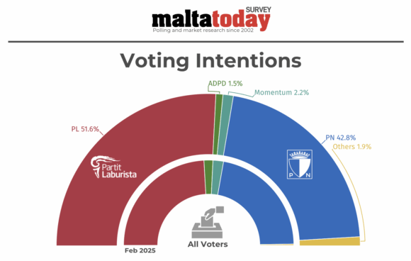 Última encuesta: Una encuesta de MaltaToday de abril de 2025 sigue apuntando a un claro dominio del PL con un 51,6% y PN con un 42,8%.