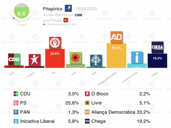 Última encuesta: La última encuesta de Pitagórica muestra una ventaja de AD sobre el PS, aunque insuficiente para lograr absoluta, con Chega rozando el 20%.