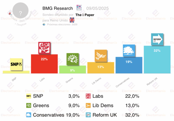 Última encuesta: Un sondeo de BMG publicado el 9 de mayo otorga un 32% de apoyo al partido de Farage, mientras laboristas, liberal-demócratas y conservadores rondan el 20% de los apoyos.
