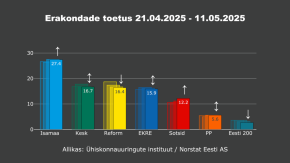 Última encuesta: Una encuesta de Norstat (de mayo de 2025) muestra a Isamaa con un 27,4%, seguido por el Partido del Centro con un 16,7% y Reform con un 16,4%. SDE obtiene un 12,2% y EKRE un 15,9%.