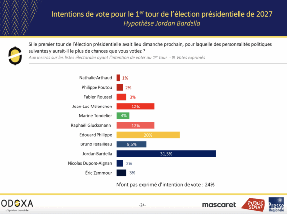 Última encuesta: Una encuesta de Odoxa de abril de 2025 muestra a RN con un 31,5%, Renaissance con un 20% y un empate entre el PS y LFI en tercer lugar en el 12%.