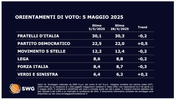 Última encuesta: Una encuesta de SWG de mayo de 2025 muestra a Hermanos de Italia con un 30,1%, PD con un 22,5% y M5S con un 12,2%.