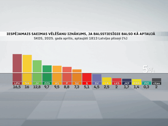 Última encuesta: Una encuesta de SKDS del 27 de abril de 2025 muestra a LPV con un 16,5%, Nacionālā Apvienība con un 16% y Jaunā Vienotība con un 12,8%.