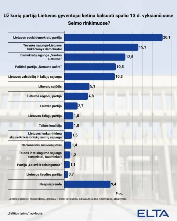 Última encuesta: Una encuesta de Baltijos tyrimai publicada hace meses muestra a LSDP con un 20,1% de intención directa, TS-LKD con un 15,1% y DSVL con un 12,5%.