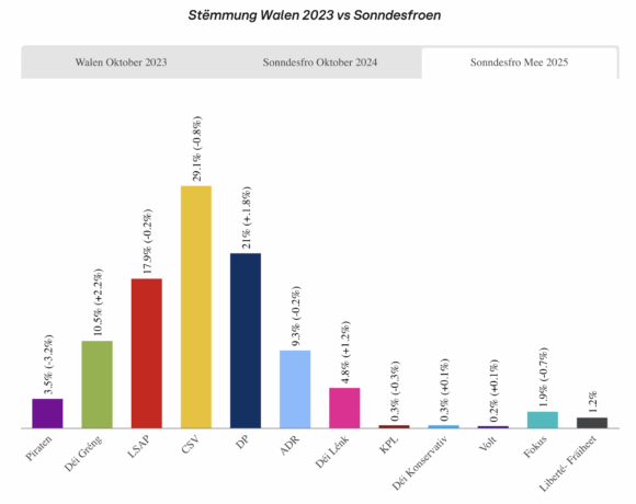 Última encuesta: Una encuesta de TNS de abril de 2025 muestra al CSV liderando con un 29,1%, seguido por DP con un 21% y LSAP con un 17,9%. ADR obtiene un 9,3%, los Verdes un 8,6% y el Partido Pirata un 6,7%.
