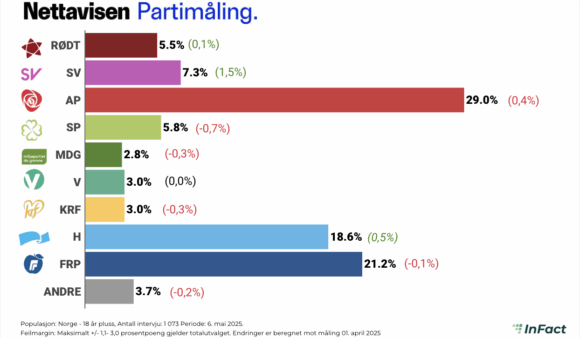 Última encuesta: Según una encuesta de InFact del 6 de mayo de 2025, Ap lidera con un 29%, seguido por FrP con un 21,2% y Høyre con un 18,6%. El bloque rojo (Ap, SV, MDG, Sp, R) tiene un 50,4%, mientras que el bloque azul (H, FrP, V, KrF) alcanza un 45,8%, proyectando 90 escaños para el azul frente a 79 para el rojo.