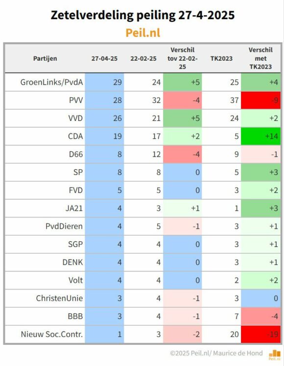 Última encuesta: Una encuesta de Peil de abril de 2025 muestra un empate técnico en la primera posición entre PVV y GL/PvdA con 28-29 escaños.